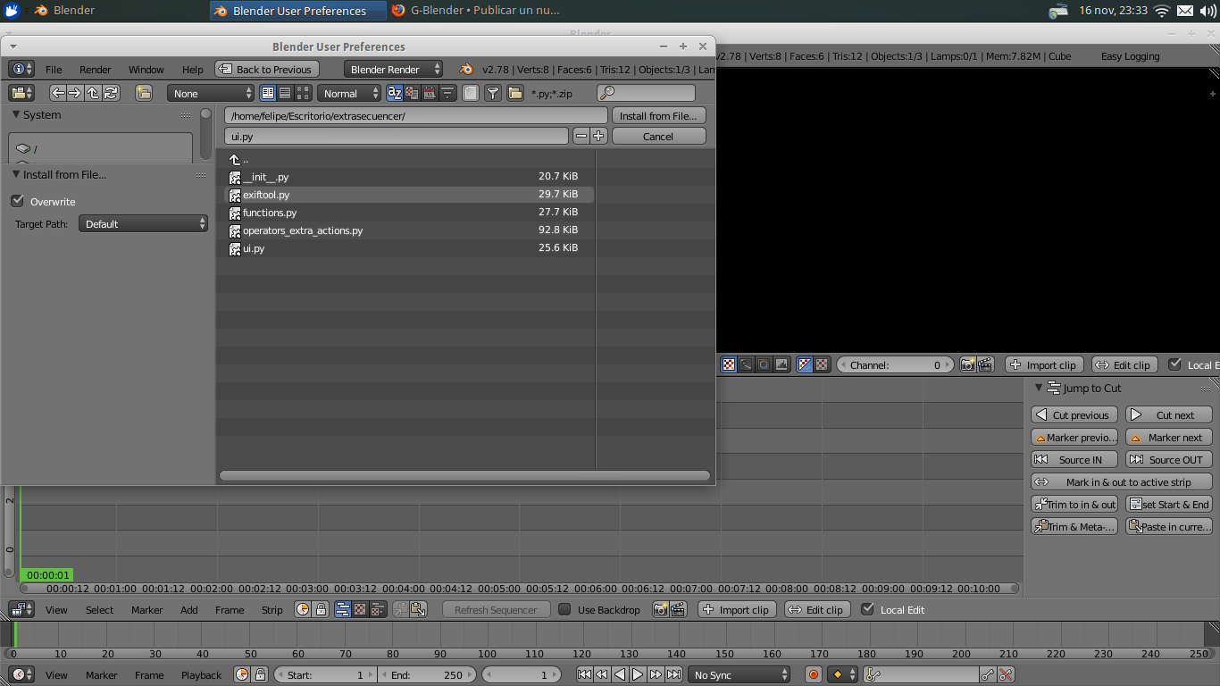 He intentado instalar el VSE Transform tool addon y tampoco me deja...una vez que pulso install from file se vuelve al panel con todos los addons y no aparece el nuevo. Parece que es un problema de programa.