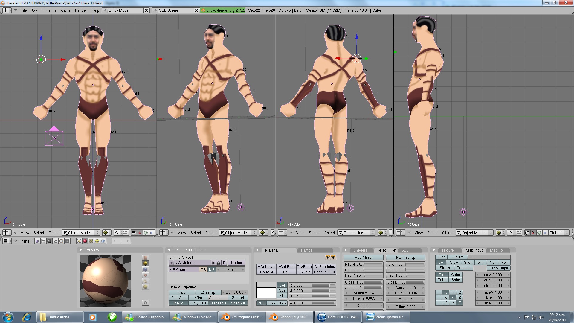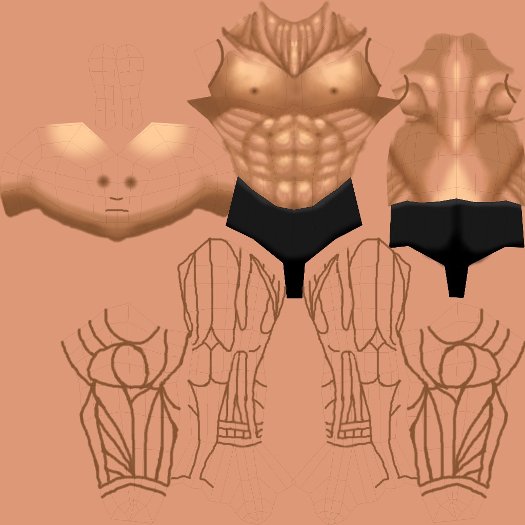 Modelé ya un personaje mediante boxing, asigné armature, skin, hice unwrap, le di una textura de color unicamente, (No se usar Photoshop, uso Photopaint de Corel) me quedé perdido en lo que sigue; bump map, specular, emisiones, etc.