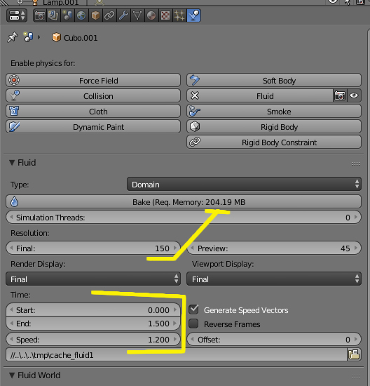 ¿Que tal chicos? Estuve mirando un tutorial de Blender en internet (https://www.youtube.com/watch?v=Ls1oY7HBGKA) Este se trata sobre fluidos, hice todo bien pero cuando finalice todo no me gusto como quedo, el agua desciende muy rápido, le modifique el parámetro de "Fin" y el de "Velocidad" pero a pesar de eso sigue estando como antes, acá pueden apreciar la imagen, también les dejo el archivo del proyecto