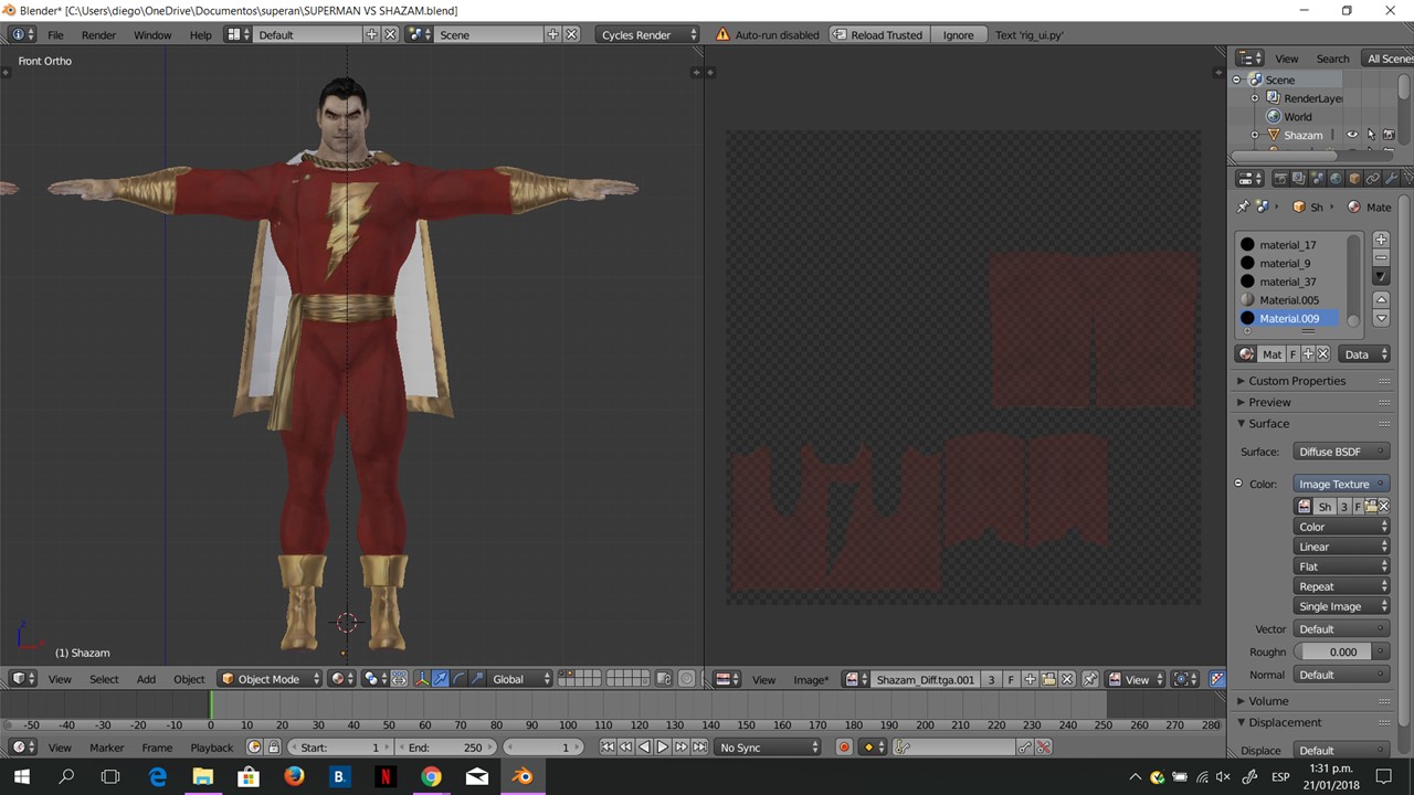 hola, descarge un modelo 3D y este venia con sus texturas, la textura principal, osea la que tiene la cara y el cuerpo es la que se ve a la derecha de la imagen, solo se ven unas manchas rojas pero al agregarle esa imagen al material del objeto y en la opcion material se ve bien pero cuando veo el objeto en renderizado toda la parte que tiene esa textura aparece en negro, como arreglo esto (esta en cycles)