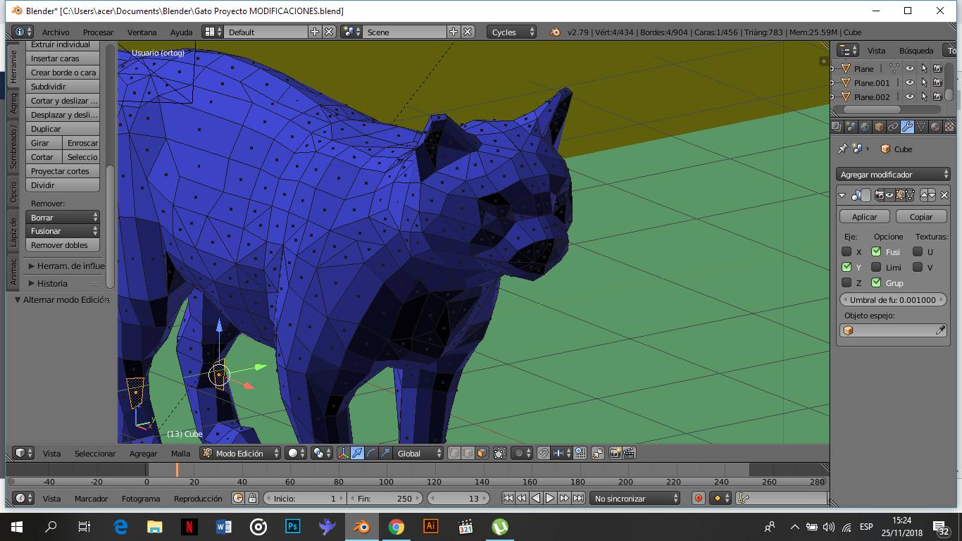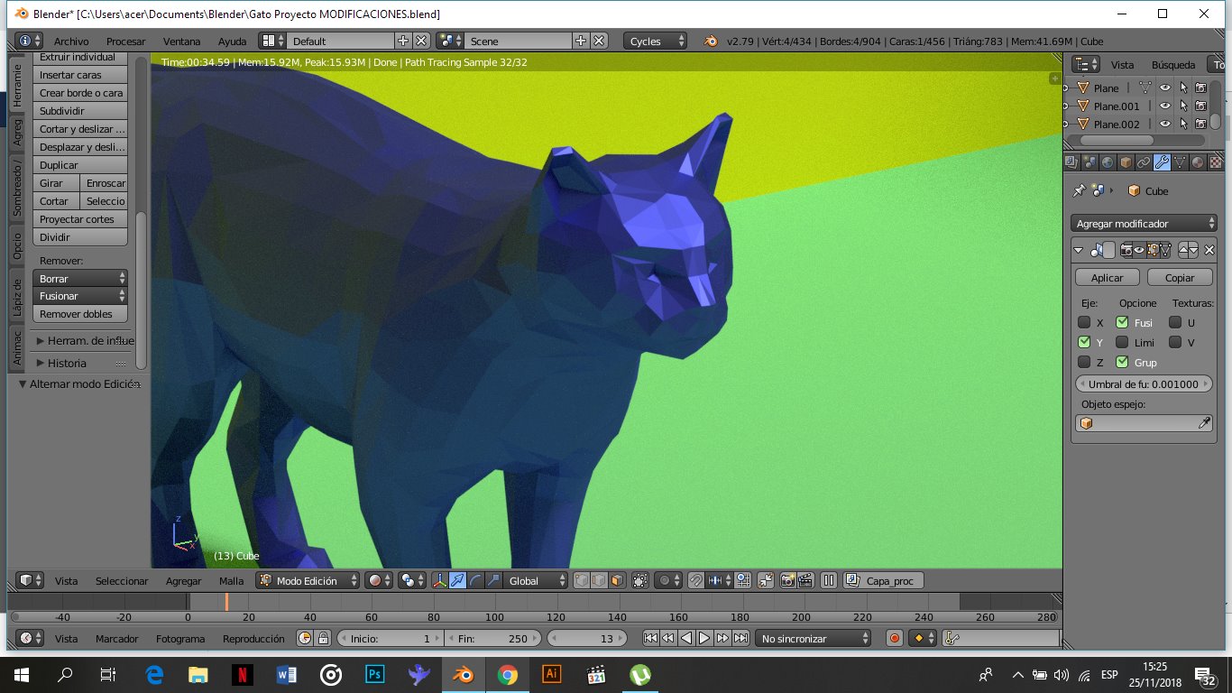 Resulta que tengo un modelo de un gatito y lo construí a partir de muchos nodos. Sin embargo, mi problema es que cuando se renderiza la imagen, aparecen muchos elementos indeseados porque los polígonos no son bien interpretados. Lo que yo deseo conseguir una herramienta de blender que me permita "aplanar" (o al menos así le llamo yo) aplanar las caras para que el gatito que hice se vea identico al momento de renderizar la imagen.