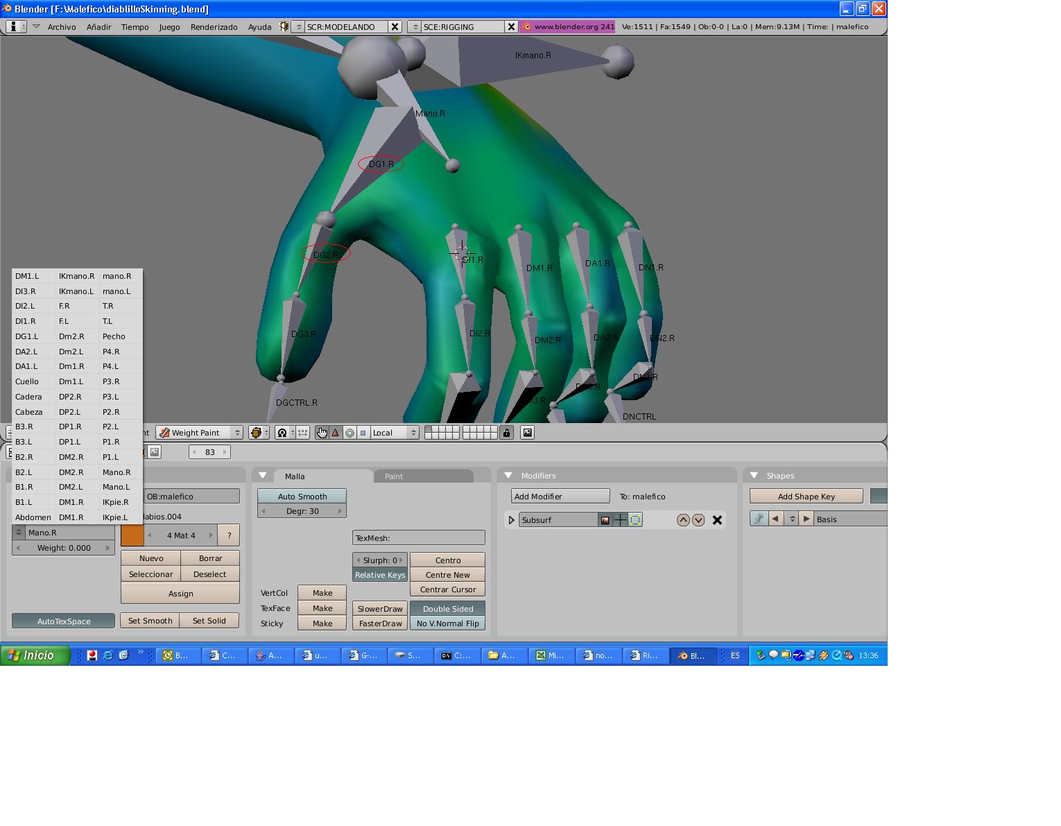 Buenas otra vez, me ha salido otro problema. He creado los grupos de vértices y los he unido a su respectivo hueso. Pero en las manos cuando muevo los huesos no me coje bien toda la maya. Estoy siguiendo el manual de maléfico, todas las extremidades me sale bien menos las manos.