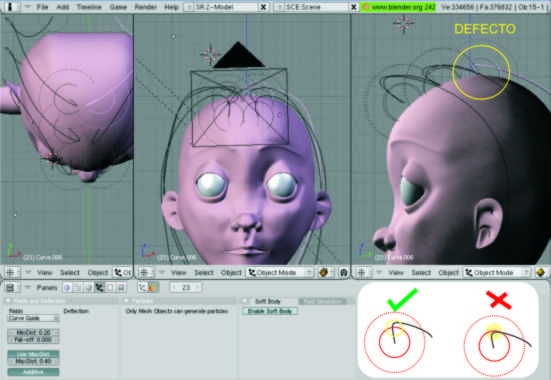 dice que hace el pelo, y pa darle forma le aplica una curva guía, y es a esa curva guía a la que le aplica lo de los cuerpos blandos. lo de las partes calvas ni idea.