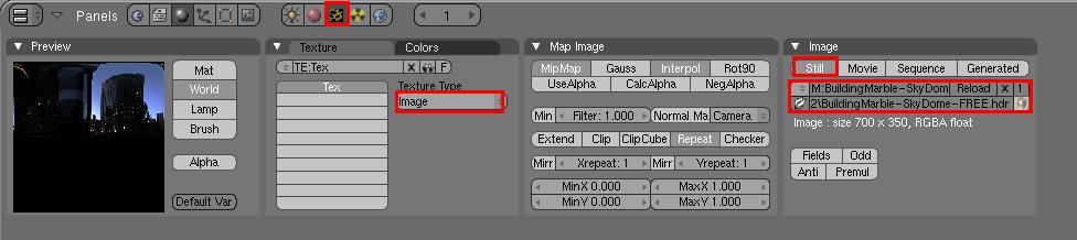 lo que esta en la imagen de nombre \"1\" es valido para usarlo tambien como textura del material del auto, solo que en la ventana map image marca extend y no repeat, para cargar la imagen en la ventana image>boton load, y ahi buscas donde esta guardada tu .hdri :-D