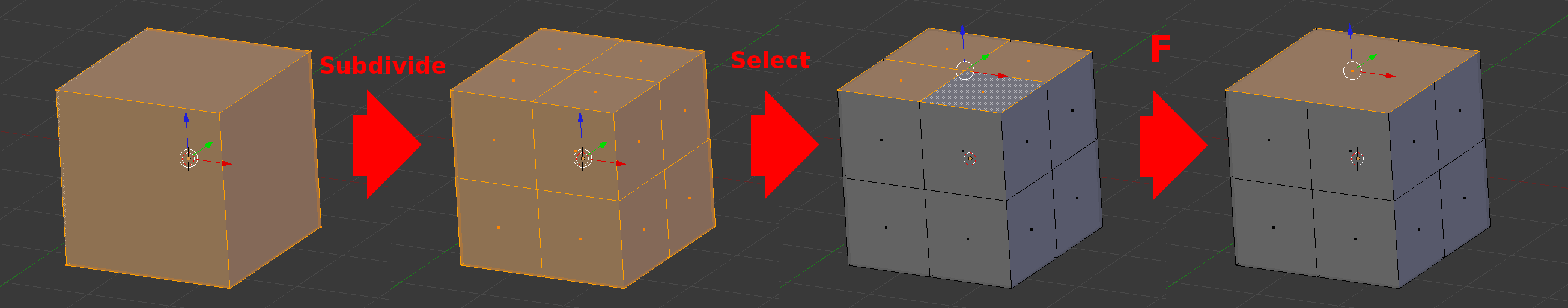 Esto hace que solo sea posible unir dos caras triangulares en una cuadrada. Para probar esto: seleccioná dos caras triangulares contiguas que estén en un mismo plano y presioná la tecla \"F\". Esto va a transformar la selección en una cara cuadrada (\"F\" es por \"Face\", \"cara\" en inglés, pero te lo podés acordar por \"Fusión\" si te resulta más cómodo). Esta técnica es muy útil en modelado porque también te permite seleccionar vértices y unirlos según cuántos tengas seleccionados: