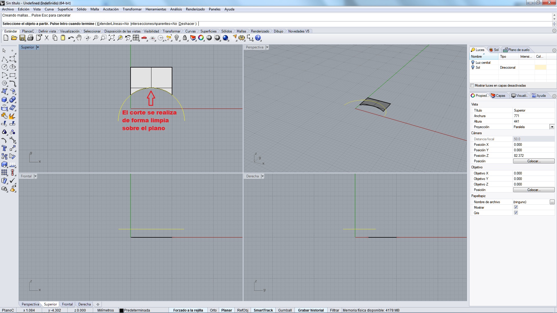 Un dato importante, si proyectamos la curva en vista perspectiva, esta se proyectará según sea nuestra perspectiva, con lo cual si queremos hacer un corte en el centro del plano pero aparentemente la curva coincide sobre una lado o una esquina, nos cortará precisamente eso, el lado o la esquina.