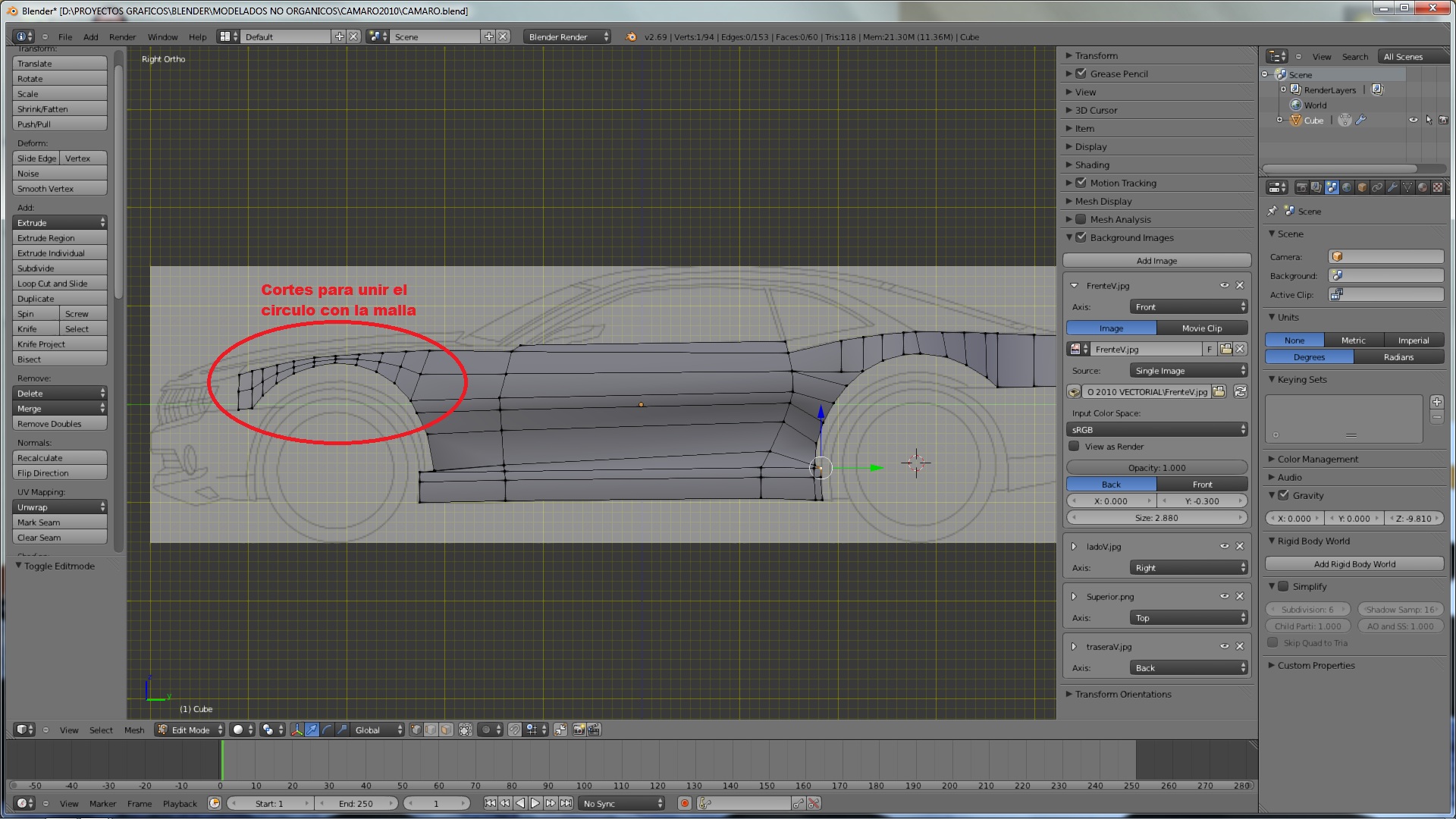 Las capturas son de Rhinoceros, en ella uso un arco de circunferencia para realizar un corte sobre un plano, la idea es saber si blender tiene algo similar, así se evitaría tener que hacer muchos cortes cuando se modela sobre todo cuando es una forma un poco \"complicada\". Por ejemplo, ahora mismo ando modelando un Chevrolet Camaro y cuando tengo que hacer el hueco de las ruedas, le agrego un circulo elimino vertices y la parte extruida la uno con Alt-M pero en la parte entre el capo y el hueco de la rueda, tengo que hacerle muchos cortes para que la forma sea circular (adjunto captura)