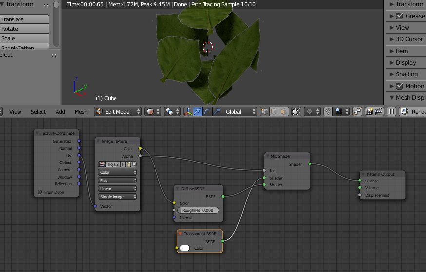 Hola buenas noches, hace tiempo había hecho una consulta similar solamente que esa vez estaba utilizando el motor interno, ahora la duda es la de cómo aplicar la trasparencia que poseen algunas imágenes de textura como las que tienen las hojas de los árboles usando el motor Cycles. Esto es para utilizarlo en la texturas que quiero aplicar en el modelo de un árbol, estuve probando aplicando nodos diferentes pero no logré aplicar la transaprencia de las imágenes.