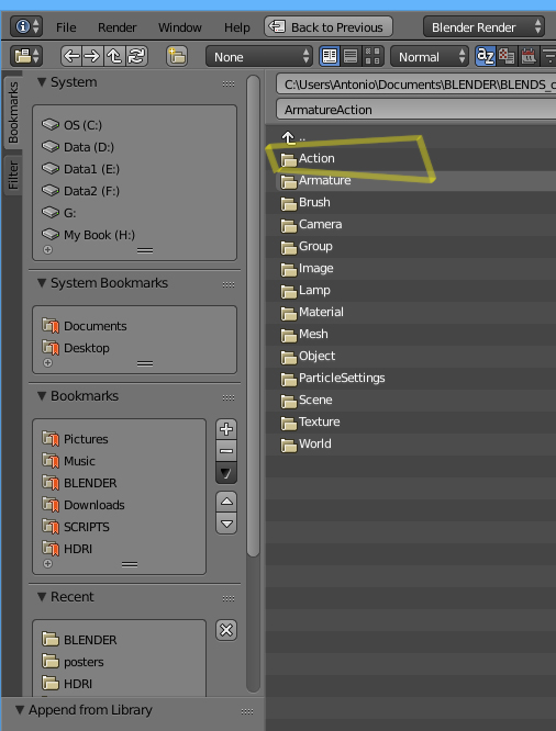 No.... me refiero a hacer un APPEND de una ACTION que tengas en el otro Blend