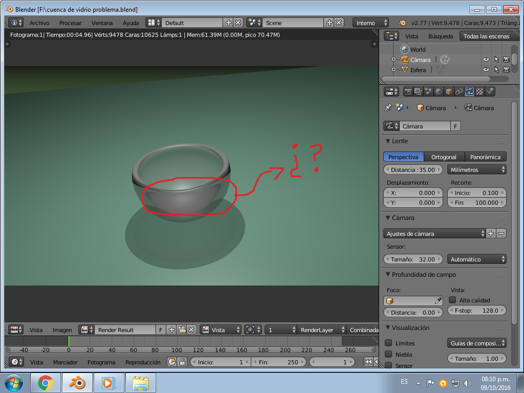 Hola ¿como estan? Estuve modelando una cuenca de vidrio cortando la mitad de una esfera, le agregue modificadores como el de Solidificar y el Surface, el problema comienza cuando le agrego el material con el efecto de transparencia, en una parte del objeto aparece un pequeño defecto (una cosa de color blanco) No se si sera algún problema relacionado con las normales o algo por el estilo, acá les dejo la imagen y también el archivo