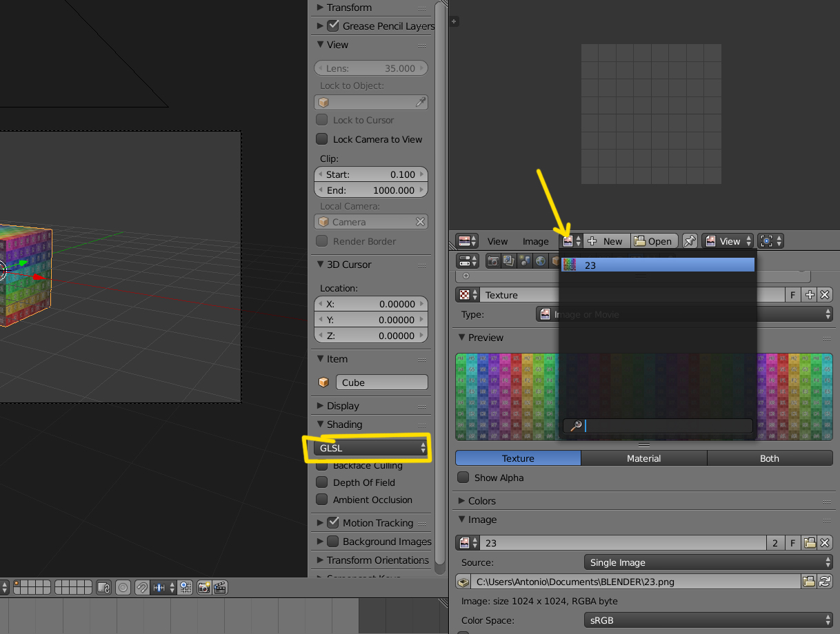 Para saber si tienes la textura de imagen bien puesta, mira en el UV/Image Editor.