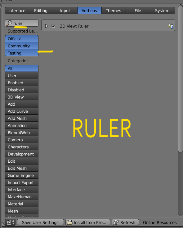 Se activa desde User Preferences > Addonds > y en Testing, buscamos RULER y lo activamos marcando la casilla y si quieres que ya siempre salga al inicier blender, presionas el botón de SAVE USER SETTINGS