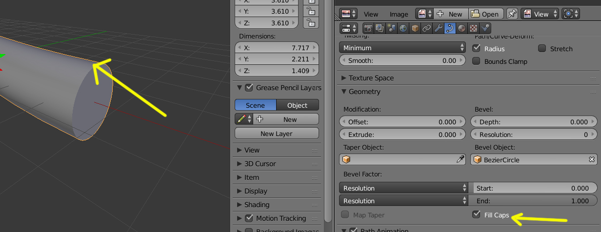 Utilizo la herramienta Bézier de blender para entre otras cosas hacer las típicas tuberías, el problema que tengo es que en los extremos de dichas tuberías están abiertas y me gustaría que estuvieran cerrados con tapas. ¿Cómo puedo conseguir que estos extremos se cierren sin pasar las nurbs a polígonos.
