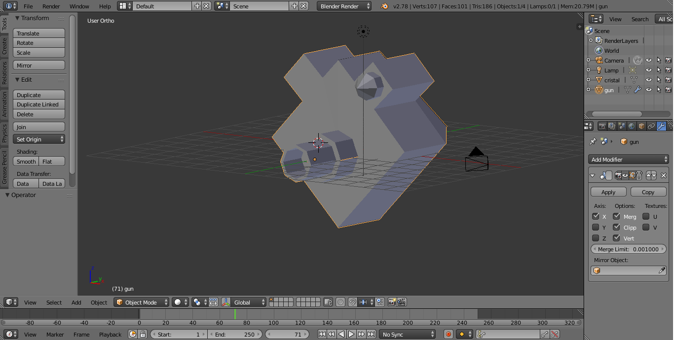 Para los cristales, coloque el pivote en el centro de plano (0,0,0) y luego aplique sobre el cristal un modificador de espejo y luego uni los objetos con Ctrl + J