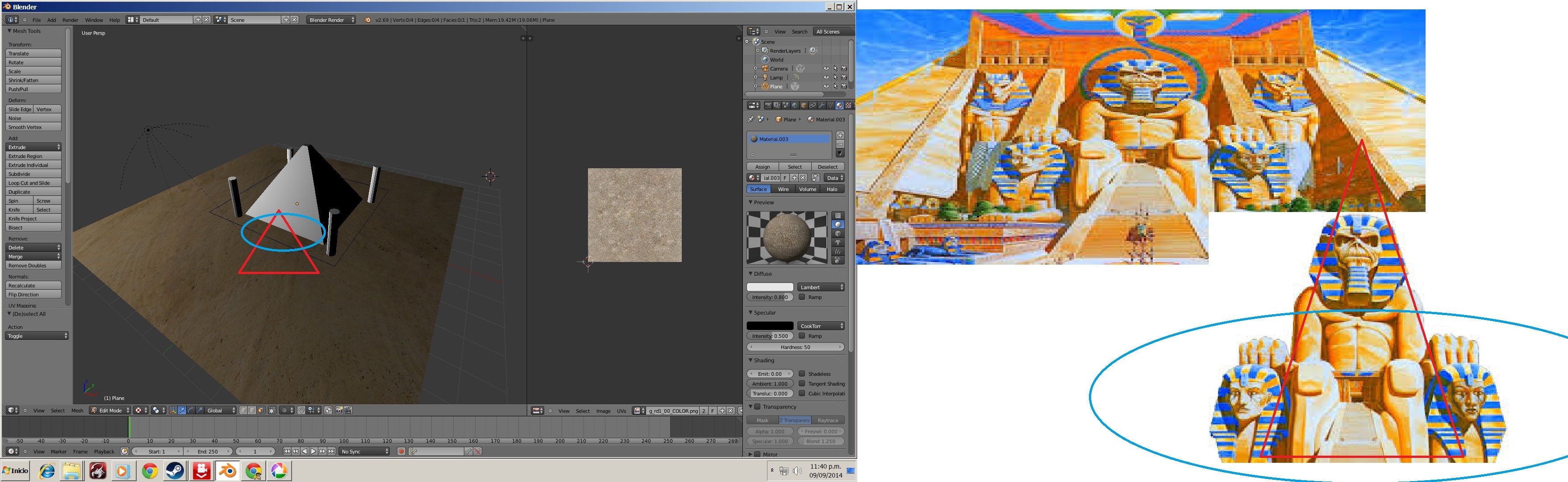 2 . si como cosa del destino se me ocurre pegarle a la piramide un "eddie" (el personaje de iron maiden) como supuesto guardian de la entrada a la piramide, ¿deberia crearlo aparte y luego lo arrastro a la entrada?, (lo escalo y lo dejo "pegadito a una de las caras externas de la piramide precisamente sobre la entrada a la misma. ?) puedo probar con un mono "suzzane "para ver como queda? .