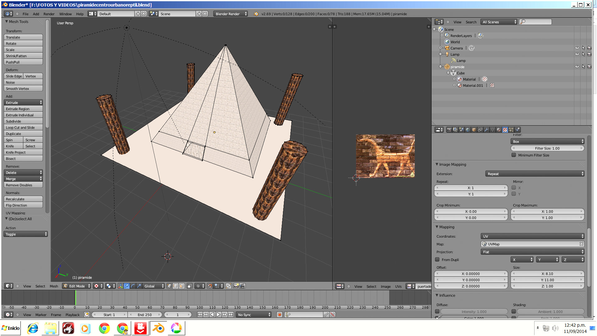 - cada circulo extruido ( pilar) tiene la misma textura de dragon, pero para hacer esto primero uni los 4 pilares a la piramide,formando un solo objeto, pienso yo que el problema radica en que al estar unido todo , cuando modifico un pilar (suponiendo que solo quiero hacer el pilar frontal mas grande los dragones, en la textura cambio los valores x e y pero estas mofican la piramide en su conjunto, tocar la letra "l" para elegir objeto por objeto me resulta complicado, sera porque ¿esta todo unido?a un solo objeto?¿la malla se llama cube? y el objeto ¿piramide? .gracias.