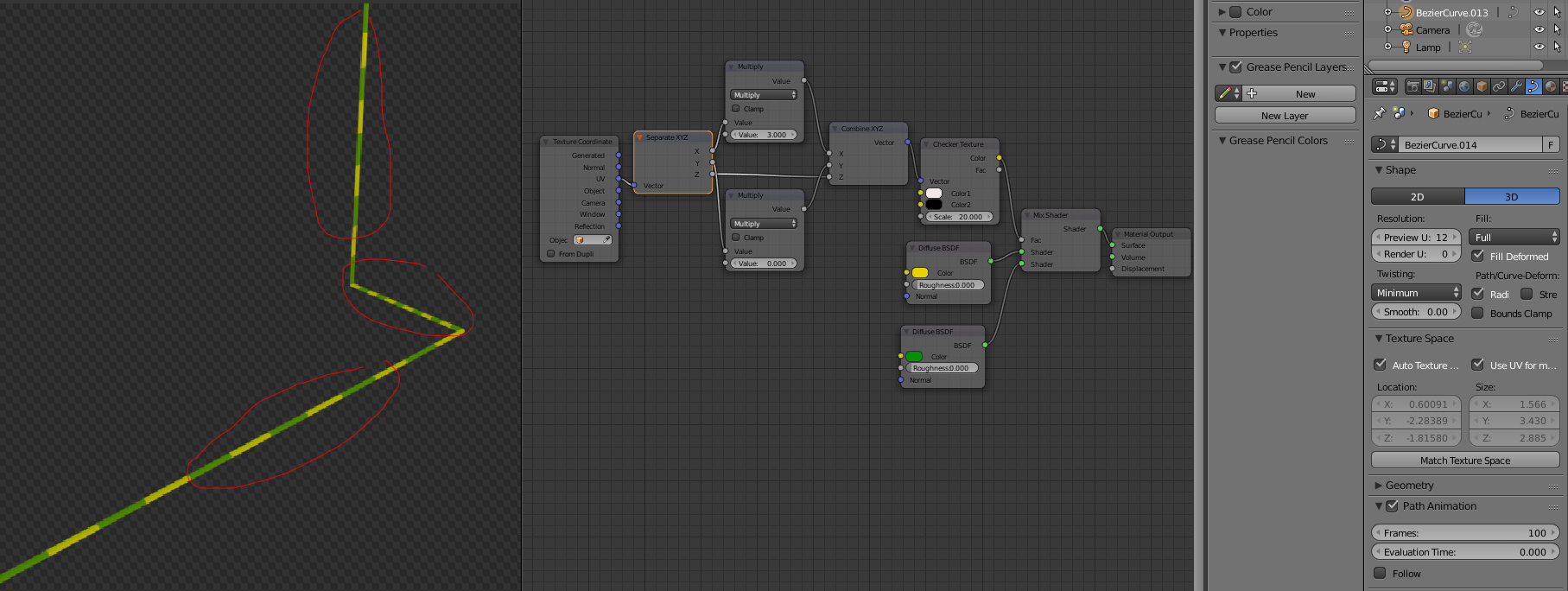 Resumen: Quiero una bezier con bevel con textura de dos colores que se vaian intercalando con la misma frecuencia independientemente del angulo y la normal del bezier.