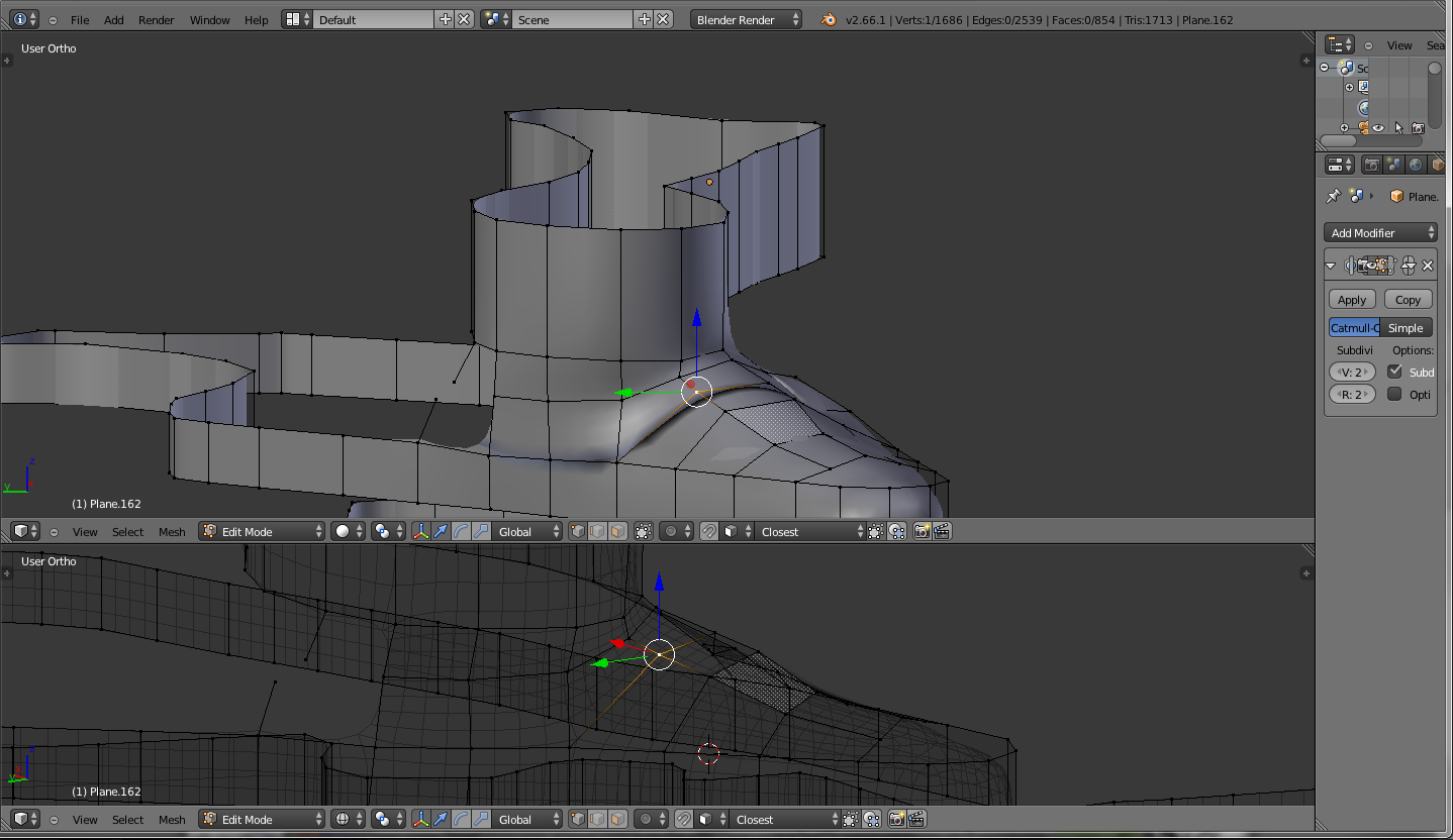 La otra opción que se me ocurre es hacer mediante un plano al que le doy 3 subdivisiones y lo aplico, le doy la forma que quiero para un núcleo dado. Extruyo el loop externo y lo muevo para que tenga la altura/profundidad dada. Después muevo los vértices del nuevo loop para la nueva forma del núcleo a ese nivel. Pero el acabado es muy feo la verdad