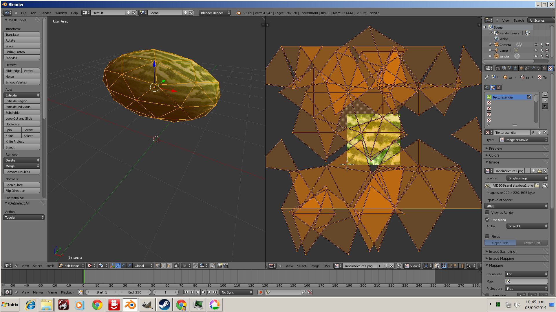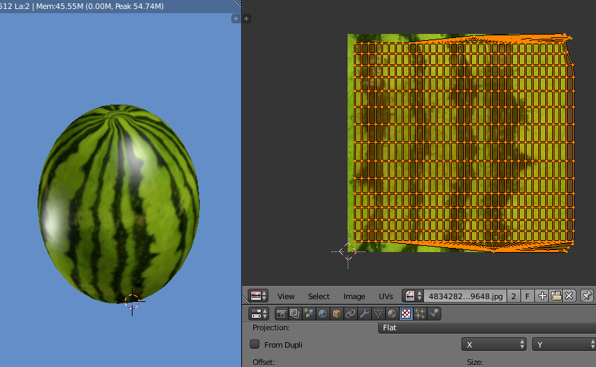 2. una vez abierto blender, hice un uv mapping de la imagen ya editada en gimp, gracias a la exportacion esta en formato png (la imagen de la sandia).aplique dicha imagen como textura. tuve que escalar y poner una proyeccion cilindrica y expandirme para asemejar una sandia. adjunto fotos y corriganme si ven algun detalle complicado para editar un juego rts.