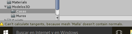 ¡Gracias! La mayoria de los problemas se solucionaron a excepción de las particulas. Cuando muevo el tejado a Unity me aparece un error que dice "Can't calculate tangents, because mesh 'Malla' doesn't contain normals"