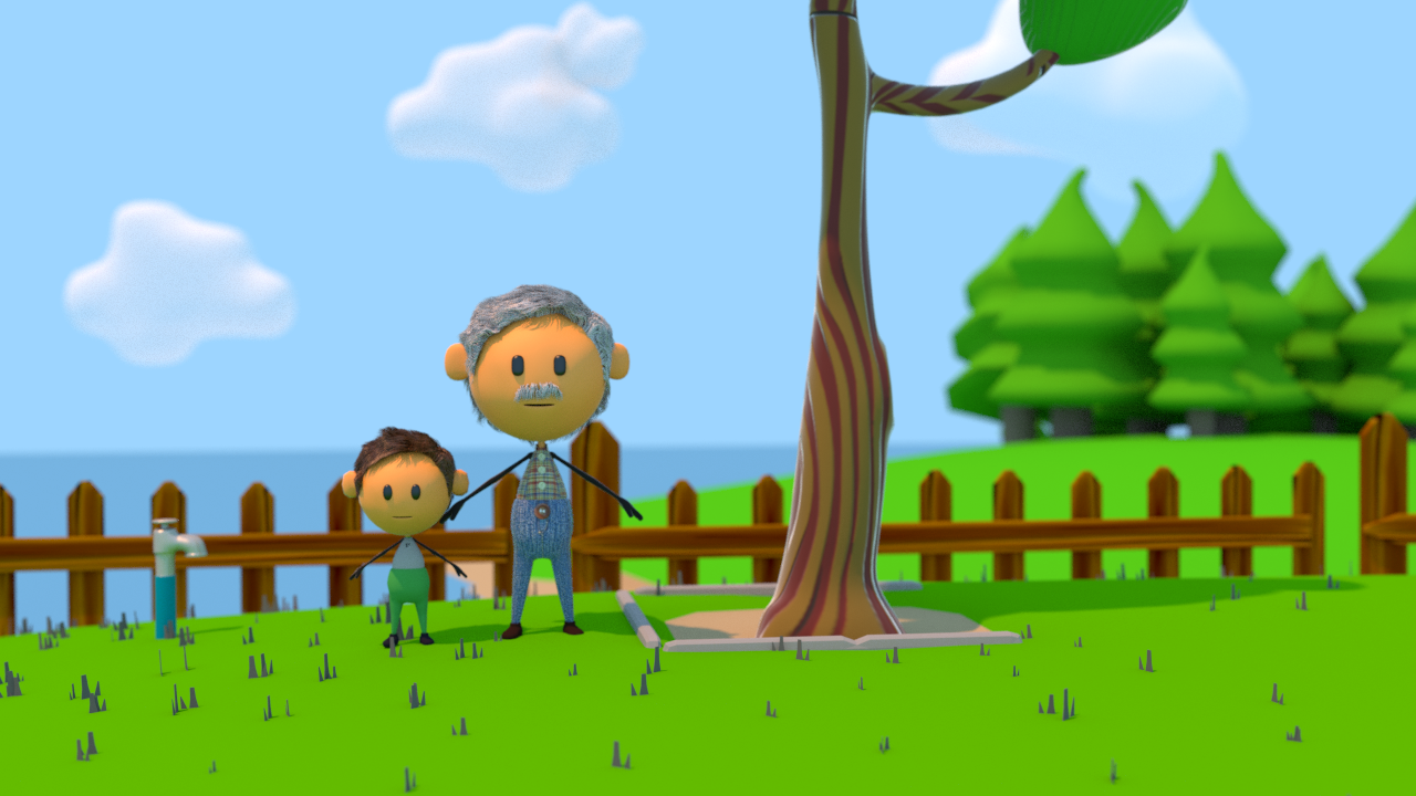 Hace tiempo(a principios de año) estaba haciendo un cortito pero Salí de vacaciones y lo deje botado, ahora es buen momento de retomar, partí con un patio y 2 personajes que interactúan en una historia, en un comienzo era triste pero ahora le toco ser un loop cartoon.