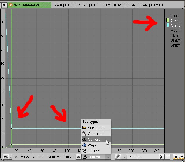 El asunto es que en un par de ocasiones tuve que modificar el clipping de la cámara porque habían unas estructuras que me impedían hacer tomas correctas de las obras, al hacer esto logre mi animación como la deseaba, pero mas tarde necesite agregar otros frames al principio para otra animacion de la camara y rode los demás keyfremes de la animacion para lograr espacio en la linea del tiempo, en consecuencia, los key frames del clipping de la camara quedaron en lugares de la linea del tiempo en los que no debian estar y me hace el clipping en donde no debe y no lo hace donde debe. Miro y miro la ventana de curvas IPO y no veo donde se registran las animaciones que se le hace al clipping. Imagino que donde quiera que esten tambien se verias animaciones como el angulo y el desenfoque. Mi pregunta es: