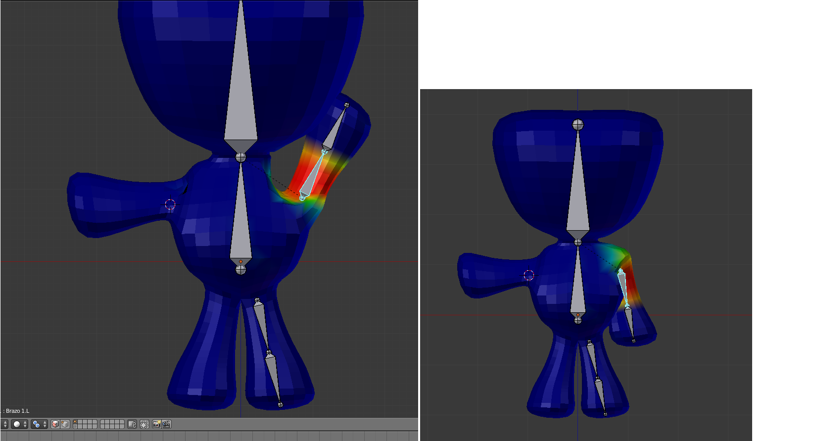 Ok, el bazo de mi personaje es el problema, cuando gira hacia arriba, se ve horrible, la forma que tona, porque hago los weigths para que al hacer hacia abajo, por los hombros se vean bien, aunque SOLO los hombros se ven bien. No sé si estoy explicandome bien. Así que necesito que cuando el hueso gira hacia arriba, el cuerpo tome una forma, y cuando se gira hacia abajo lleva una otra forma (la malla se tiene que hundir un poco cuando el brazo gira hacia abajo en un momento determinado). Algo así como shapes keys y huesos, pero yo no logro hacerlo, no se como hacer para que los huesos muevan la mallas dependiendo se su rotacion. Una ayudita?