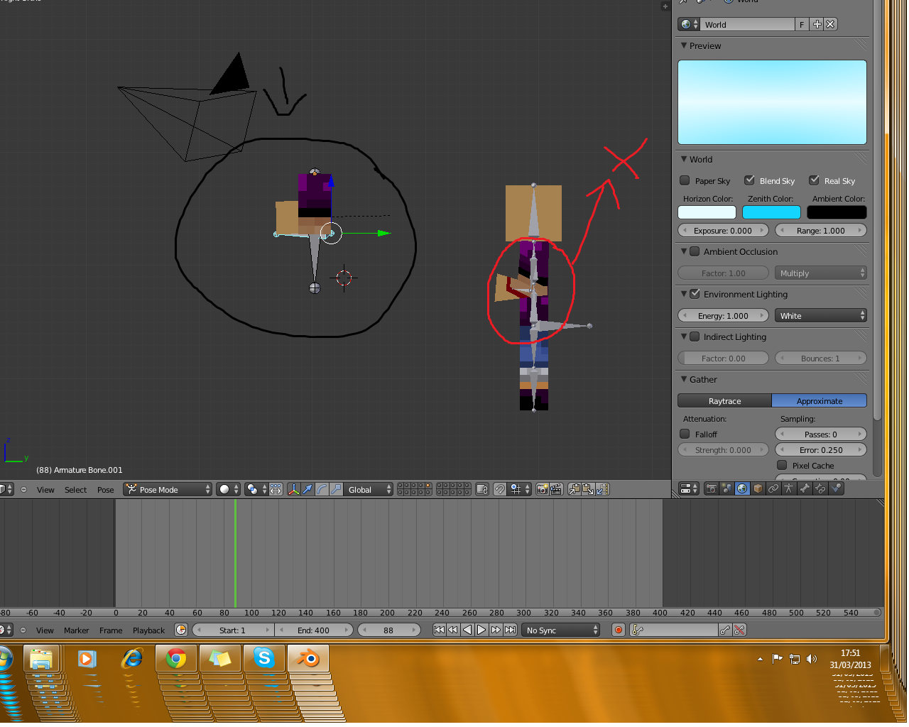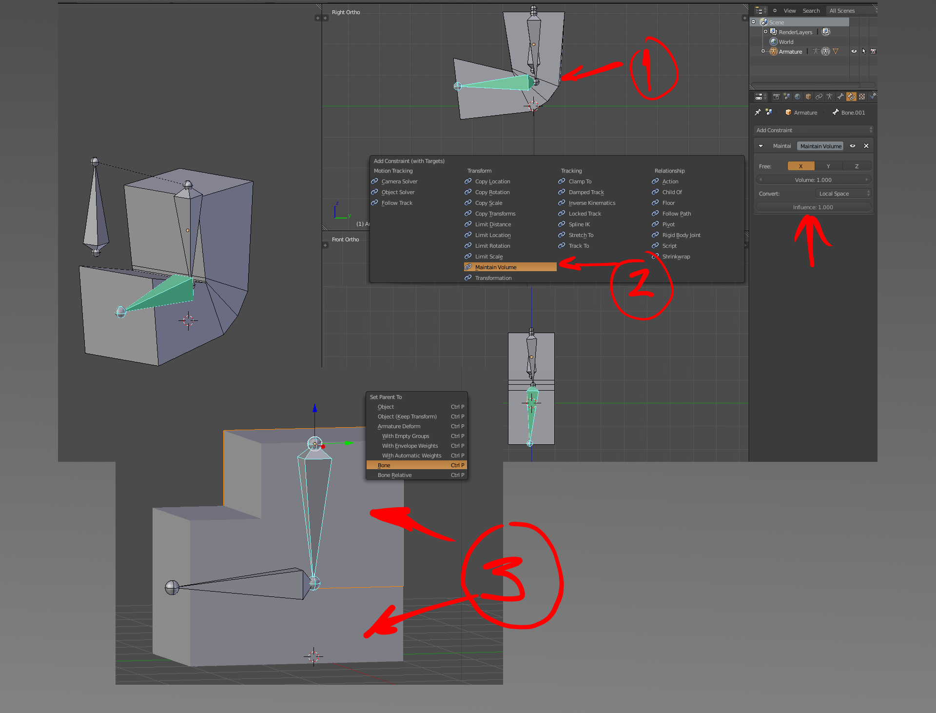 Hola soy nuevo usando blender y llevo ya un par de dias liado con el armature de los brazos y piernas del personaje debido a que quiero moverlo como el brazo del circulo negro sin que se deforme, debido a que se deforma tanto que no se queda cuadrado como podeis ver en el circulo rojo.
