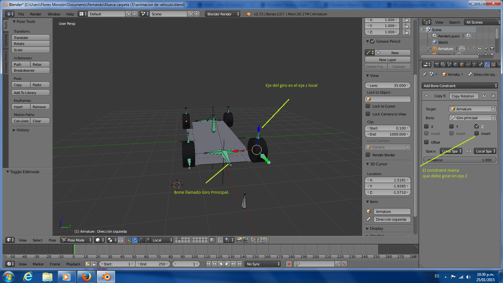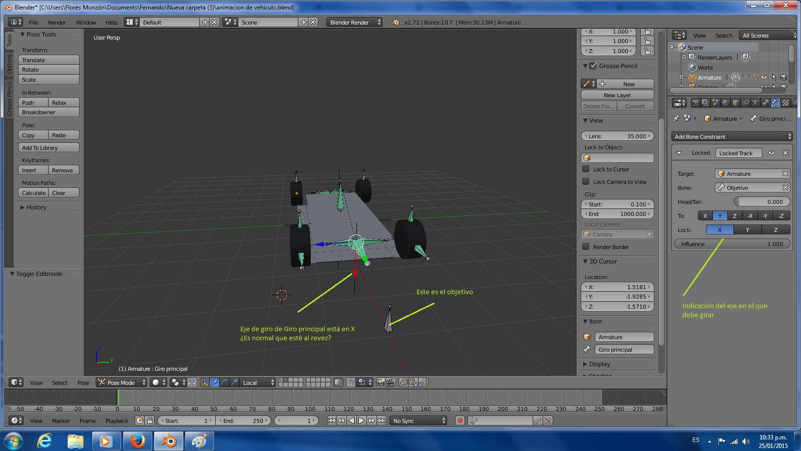 Hola, buenos días, estoy tratando de riguear un auto y he estado siguiendo los pasos de un tutorial, pero me quedé atorado, por ahora estoy colocando un objetivo para que al moverse este guie las ruedas, ya logré colocar el constraint track to en el hueso de dirección principal y se mueve en dirección a la que se mueve el objetivo, el problema que tengo es que al querer colocar un constraint de Copy Rotation en el hueso de dirección de una de las ruedas, este simplemente no se mueve, en una ocasión anterior hice los mismos pasos y no tuve problemas pero esta vez no logro encontrar la falla.