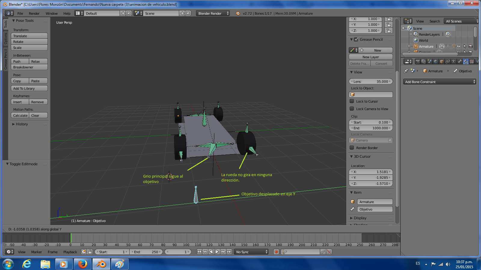 Tratando de hacer lo que mencioné hace rato, he logrado colocar un constraint de track to a las ruedas delanteras, conectándolas con un hueso objetivo a cada una, tambíen logré hacer que los huesos objetivos de cada rueda siguieran el movimiento del hueso objetivo central, por ahora parece funcionar pero tendré que esperar a ver que tal funciona cuando haga las pruebas de movimiento.