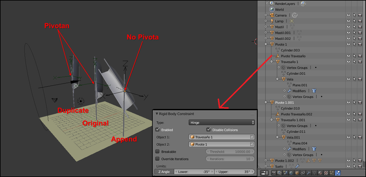 Cuando hago Append a los objetos se importan con los emparentamientos correctamente pero al darle a play la vela tampoco pivota, aunque todas las físicas están exactamente igual!
