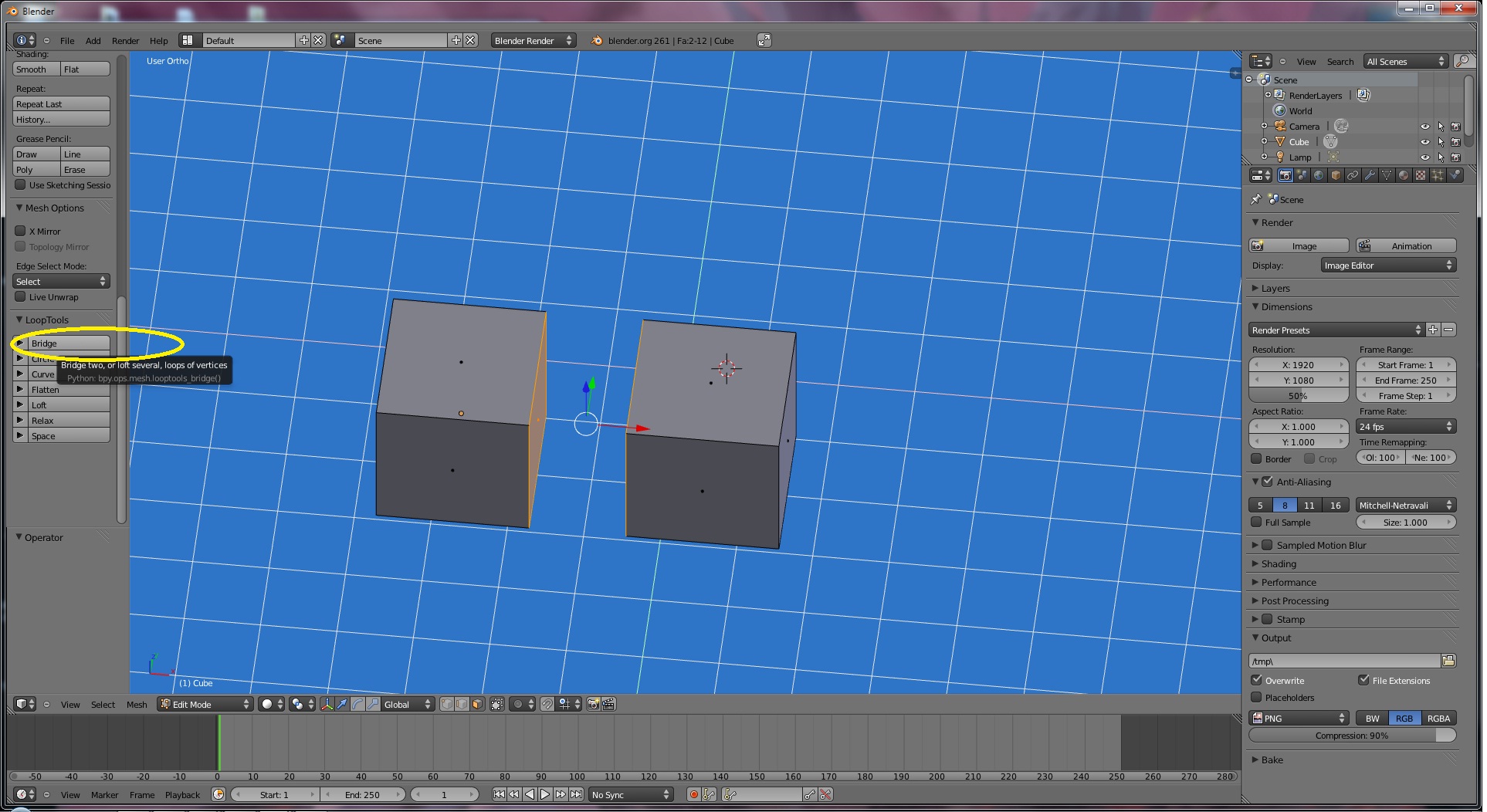 El tema es que aparte de estar aprendiendo poco a poco a manejar blender en su versión 2.6, lo hago en un portátil...que ya está un poco pasado...lo digo porque hay cosas que no las puedo hacer y ya las utilizaré cuando cambie de equipo...pero hay otras que supuestamente no son problema del ordenador....cómo por ejemplo: unir dos caras mediante la función:BRIDGE. Pues bien...estoy siguiendo un libro de blender (autor: Roland Hess) y en un tutorial del modelado de una silla me dice que seleccionando la cara y después presionando (control + alt + f) me debería de unir dos caras!! Pero cual es mi sorpresa... No hace nada!!!