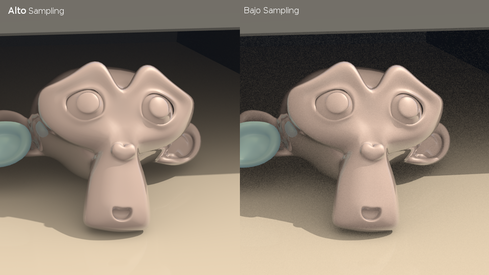 Se debe a que no estas usando la cantidad de muestras suficientes, para lograr un render de calidad final , lo que es perfecto mientras estas aún configurando la escena y tienes que estar haciendo render para visualizar los resultados. Para un render de buena calidad, Pon a valores altos el sampling, de materiales y luces, que utilizaste en tu escena: Todo raytrace y rayshadow, transparency, mirror, en el Gather; si usas Ambient occlusion, ambient light o inderect lighting, etc... donde quiera que este el parametro \"samples\" en los elementos que componen tu escena. Esto ayudará a la calidad de render para un resultado final.