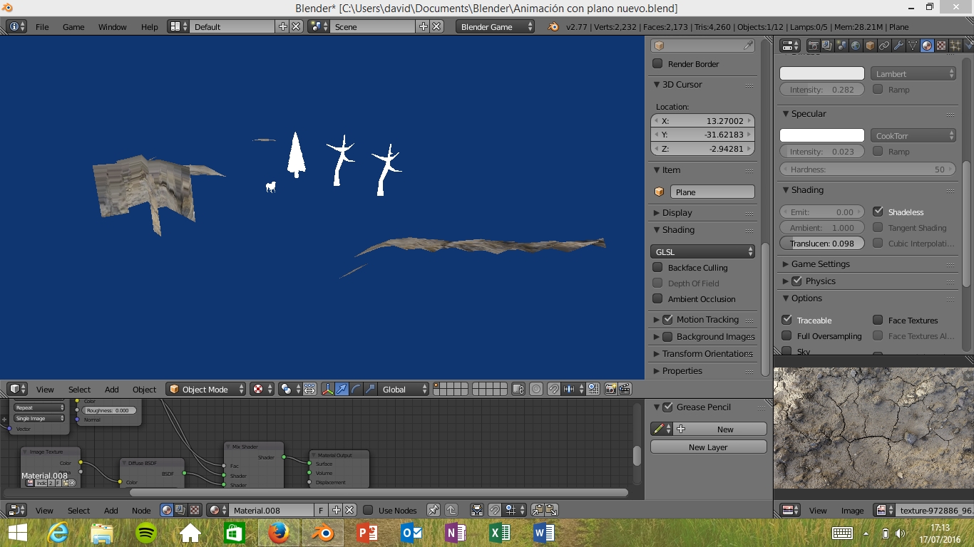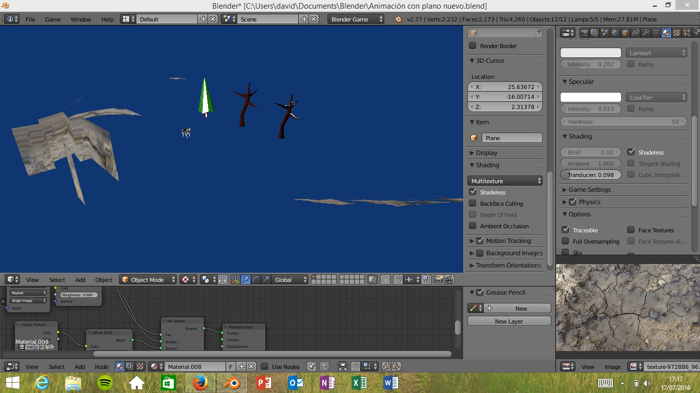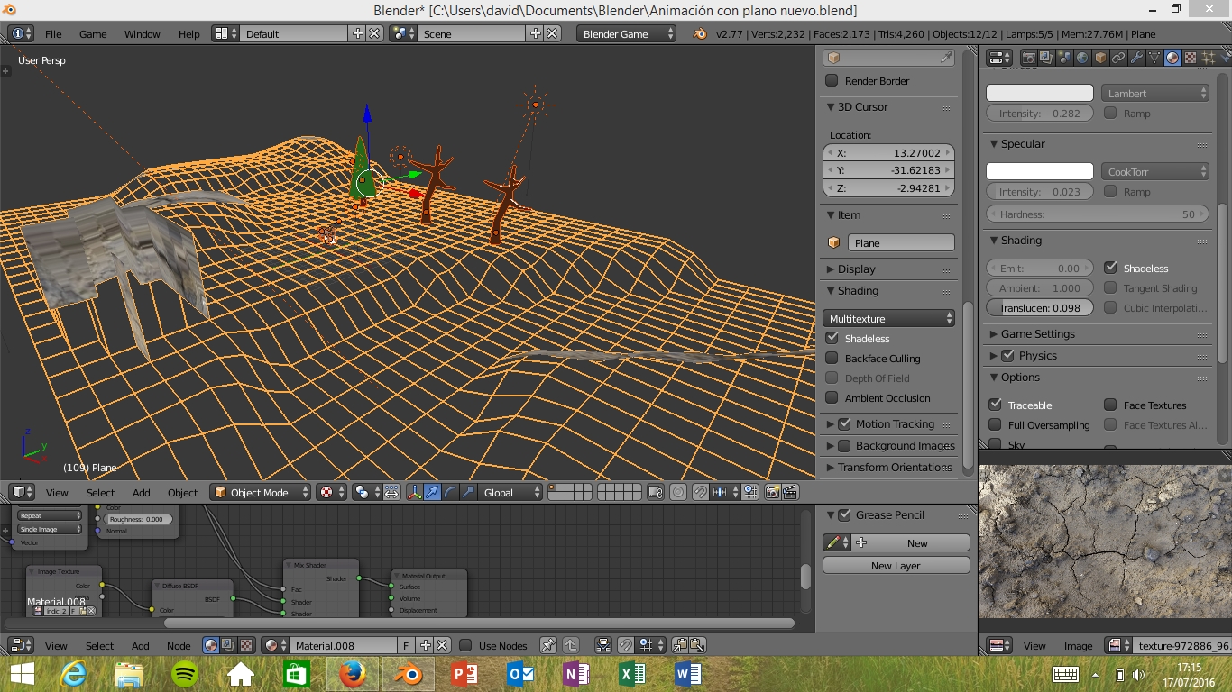 Ahora estoy liado con la textura del nuevo terreno en blender game! No se ve la textura cuando le doy a P para probar el juego, ni tampoco antes de pulsarlo, solo en cycles.