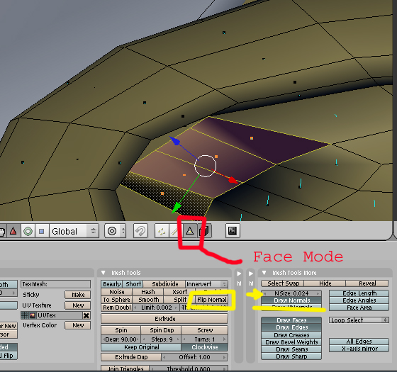 Para ver hacia donde apuntan las caras, te pones en Face Mode y en Mesh Tools More seleccionas Draw Normals y subes el valñor de arriba... NSize: (esto hace que se vea una linea azul que apunta hacia las normales)