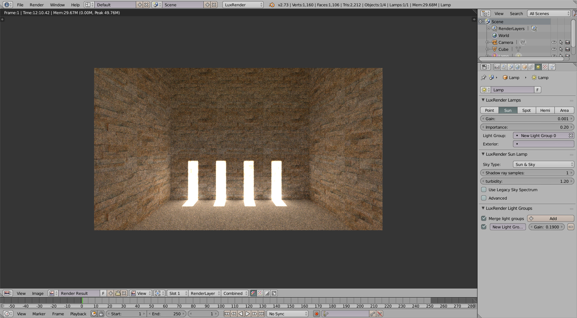 Hola, tengo un par de dudas con luxrender, y es que no consigo entender como funciona las luces en este motor de renderizado. En la imagen que adjunto, que no está finalizada, por eso se ve tanto ruido, la luz del sol que hay sobre la pared del fondo es muy fuerte y por mucho que toco los valores, no consigo reducir su brillo o la fuerza de esta luz.
