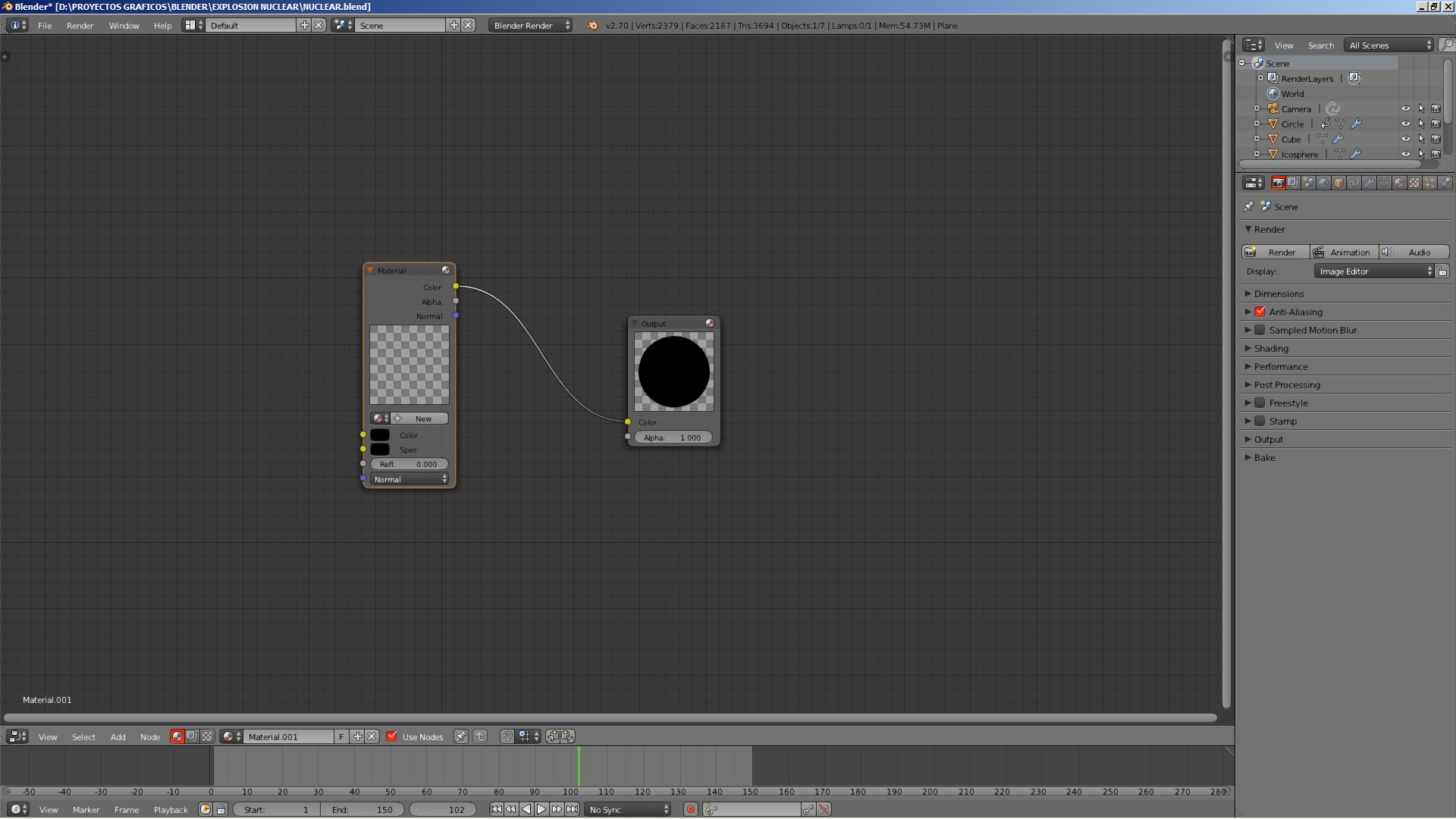 Si por fin lo conseguí gracias a dios y a Soliman, aunque me llevó toda la tarde y parte de ayer, ahora me estoy peleando con lo que sería la columna de humo (o fuego), y digo peleandome por que esta mañana la animación iba desde el frame 0 al 150 es decir, el hongo que forma la \"explosión\" llegaba animado al frame 150 pero ahora SIN haber tocado eso, cuando llega al 107 desaparece el humo y el fuego y como digo, eso de la animación no lo he tocado por que ya tenía lo que buscaba en ese sentido. Así que nada, a ver que demonios a pasado.