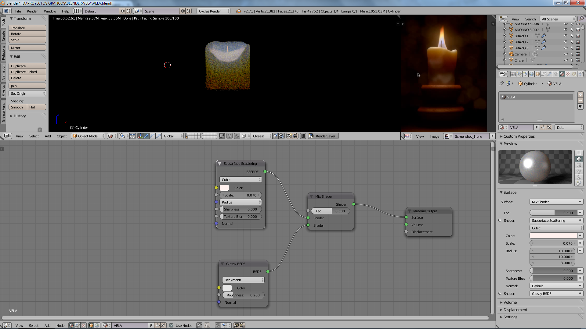 Hola, estoy siguiendo este video https://www.youtube.com/watch?v=I6F5C6JX3s0 para conseguir una vela realista con cycles. Sigo todos los pasos y asigno los mismos valores que se usan en el video tutorial, pero consigo cosas completamente distintas. Adjunto captura para que podais ver.