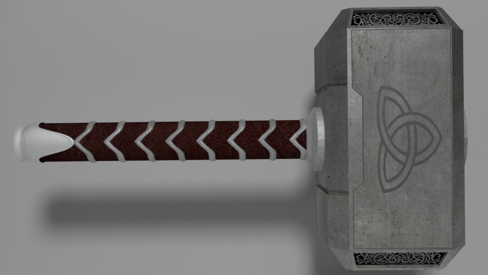 En fin hice un Mjolnir (El Martillo de Thor), tiene varios errores notables como la textura del mando que se ve un poco difuminada porque la imagen en si no era de muy buena calidad, También el símbolo que tiene en el mazo se ancho un poco por un problema que tuve en el mapeado UV, y los patrones de los bordas deberían notarse un poco mas, pero aparte de todo eso creo que me quedo bastante bien para el nivel que tengo.