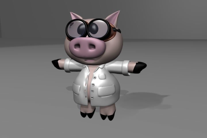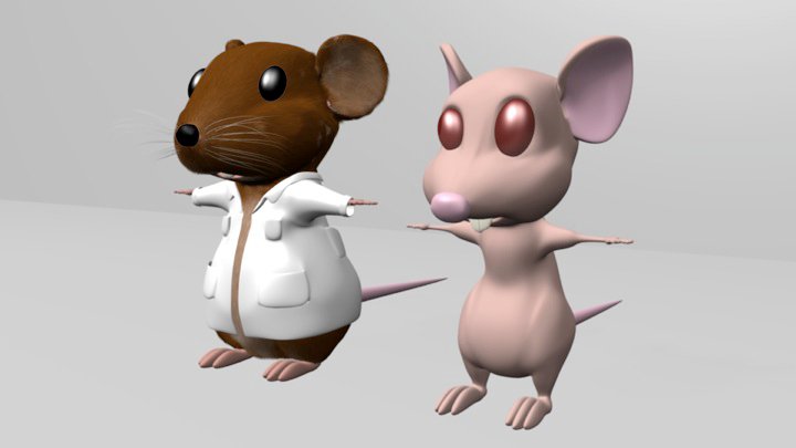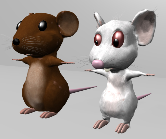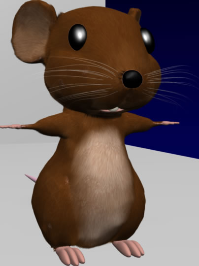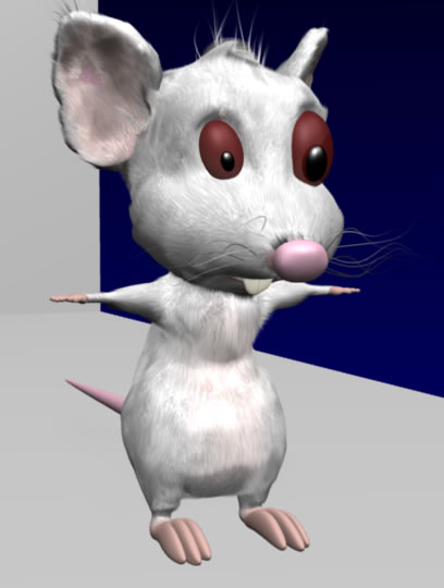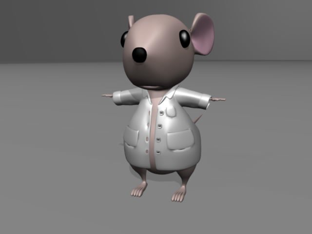 El ratón tiene pelo generado con el particle system de Blender 2.49b. Queremos ponerle la bata, con simulación de ropa (cloth simulation) o con softbodies, sin embargo aún no sabemos si van a funcionar las dos cosas juntas :-)