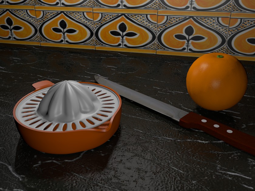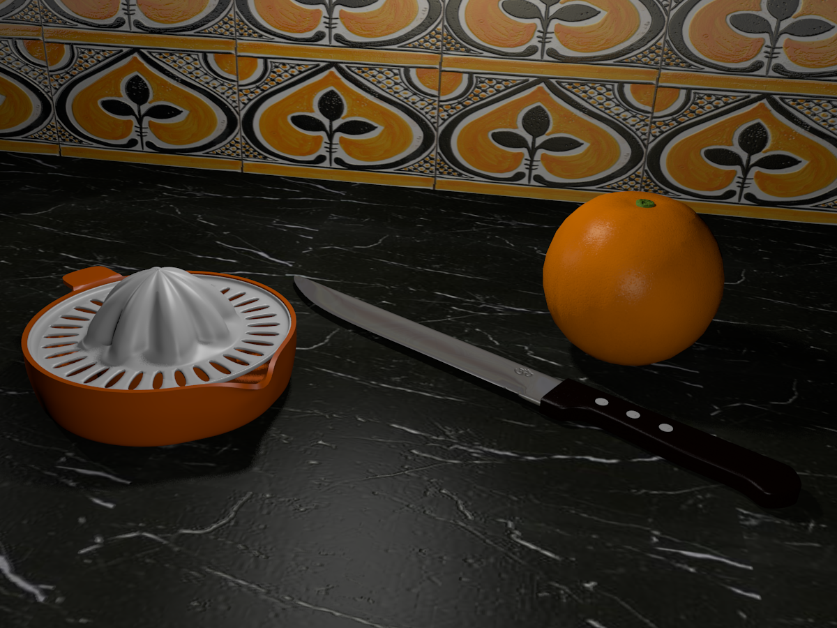 se ve bien pero si la iluminacion fue lo que fallo jaja las texturas de la naranja y la pared me encantaron y alomejor un material diferente en el mango de cuchillo