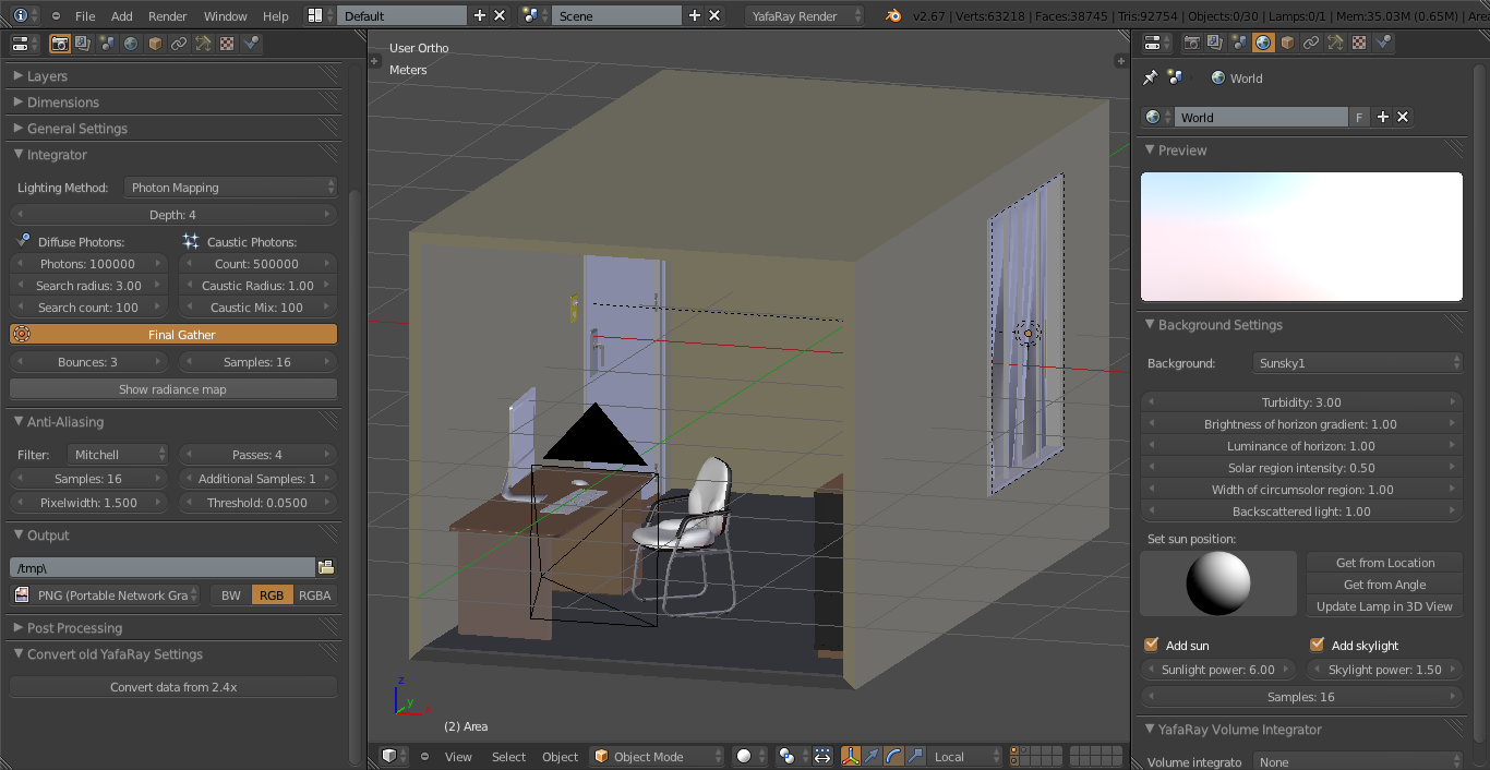 Además de esos detalles se ve bien, de las configuraciones de yafaray ya no puedo aportar mucho, hace tiempo que no lo uso y ya olvide bastantes cosas.
