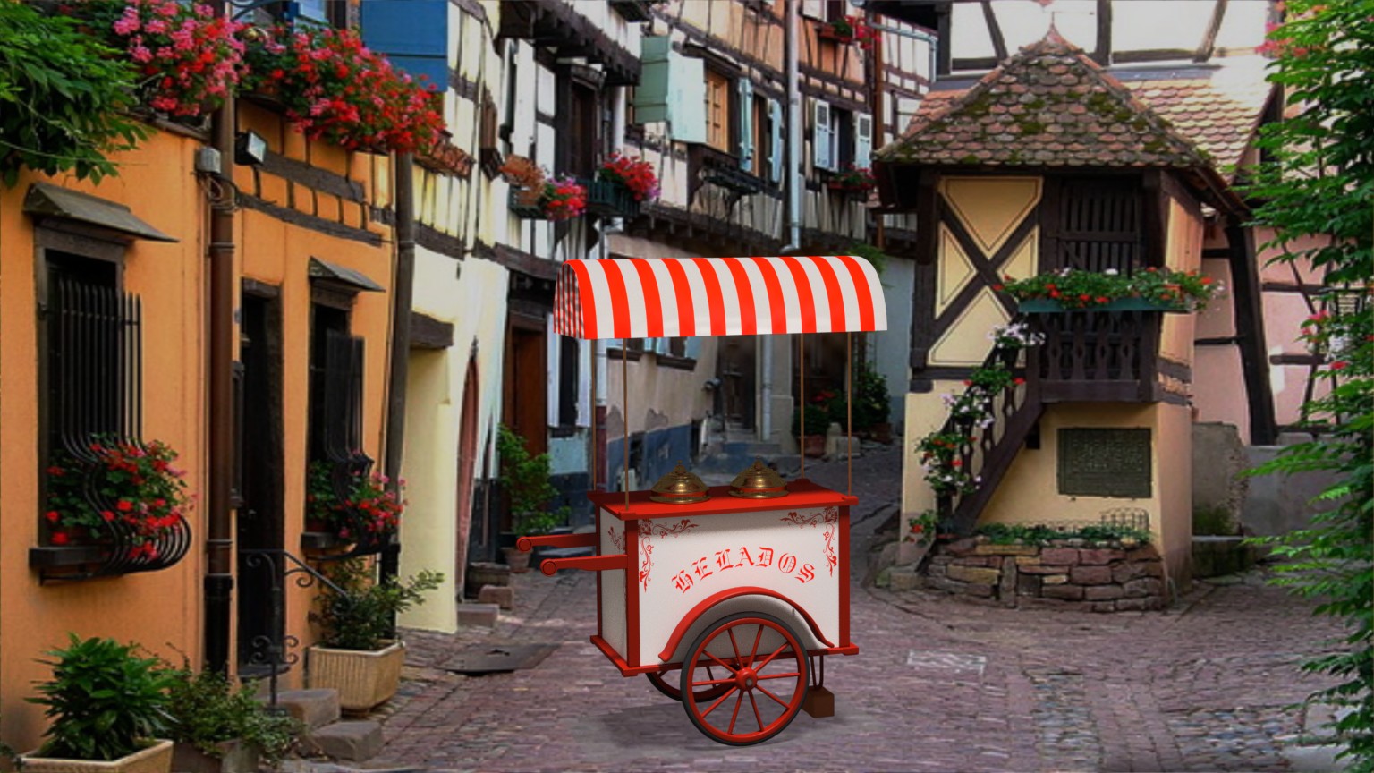 Pues nada, un carrito de helados de los antiguos, con una imagen de fondo de una callejuela...