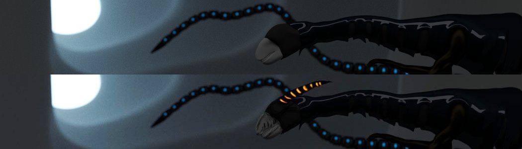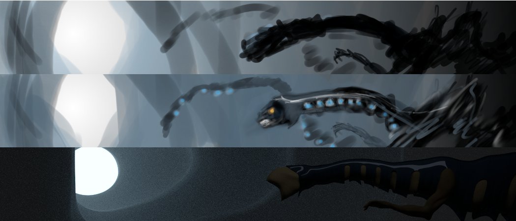 Pues en este modelé la cabeza, le proporcione de su doble hilera de dientes, y finalmente decidí pintar sobre el render cómo me gustaría el resto, hice una con ojos como del primer concepto pero me gusto más este que pongo en segundo lugar, donde le quito los ojos ya que esta criatura vive en el interior de un “sistema” aislado de luz, pues quizá le sobran, así que unos buenos cuernos fueron mi lección así que a modelaros y a echarle un poco de sculpt en general para pasar a ponerlo en pose ya que por ahora fuera de la cola, esta en ortográfico para trabajar con mirror. Los leo.