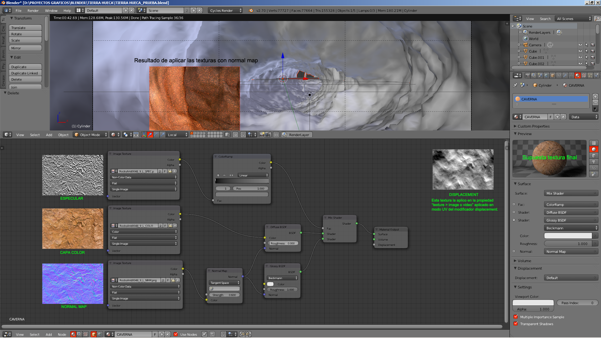 Hola, estoy intentando renderizar una caverna pero trás aplicar las texturas correspondientes, la caverna se ve lisa y suave y para nada rugosa y tosca como son las texturas.
