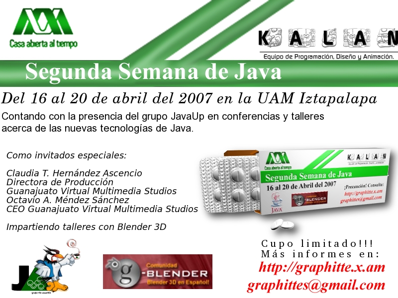 \"La Universidad Autónoma Metropolitana Unidad Iztapalapa, el Equipo de programación, Diseño y Animación: KALAN y JavaUp, invita a la comunidad G-Blender a participar en la Segunda Semana de Java, que se realizara del 16 al 20 de Abril del 2007, habrá conferencias, talleres y películas, la entrada es libre (inscripción a talleres con previa anticipación, checa las bases en http://graphitte.x.am), como invitados especiales contaremos con la Directora de Producción Claudia T. Hernández Ascencio y el CEO Octavio A. Méndez Sánchez de Guanajuato Virtual Multimedia Studios\"