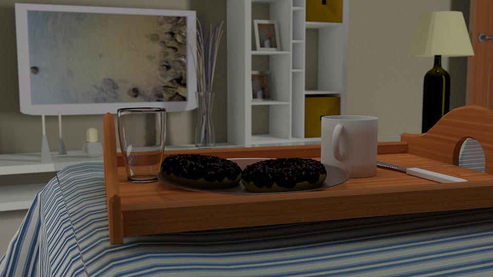 Vaya, muy buen resultado para ser de tus primeros proyectos, pero si que se tardó el render, ¿qué equipo tienes para que vaya tan lento? intenta cerrar programas y detener servicios que no necesites para liberar al procesador y agilizar el renderizado.