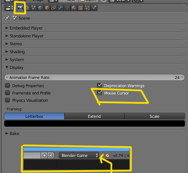 El cursor se activa desde el Blender Game > Render > Display > Mouse Cursor.