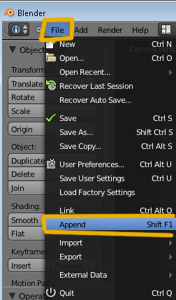 Haces el append y buscas el objeto que quieres cargar en el blens (si les has puesto nombre antes a los objetos, te será luego mas facil detectarlos)