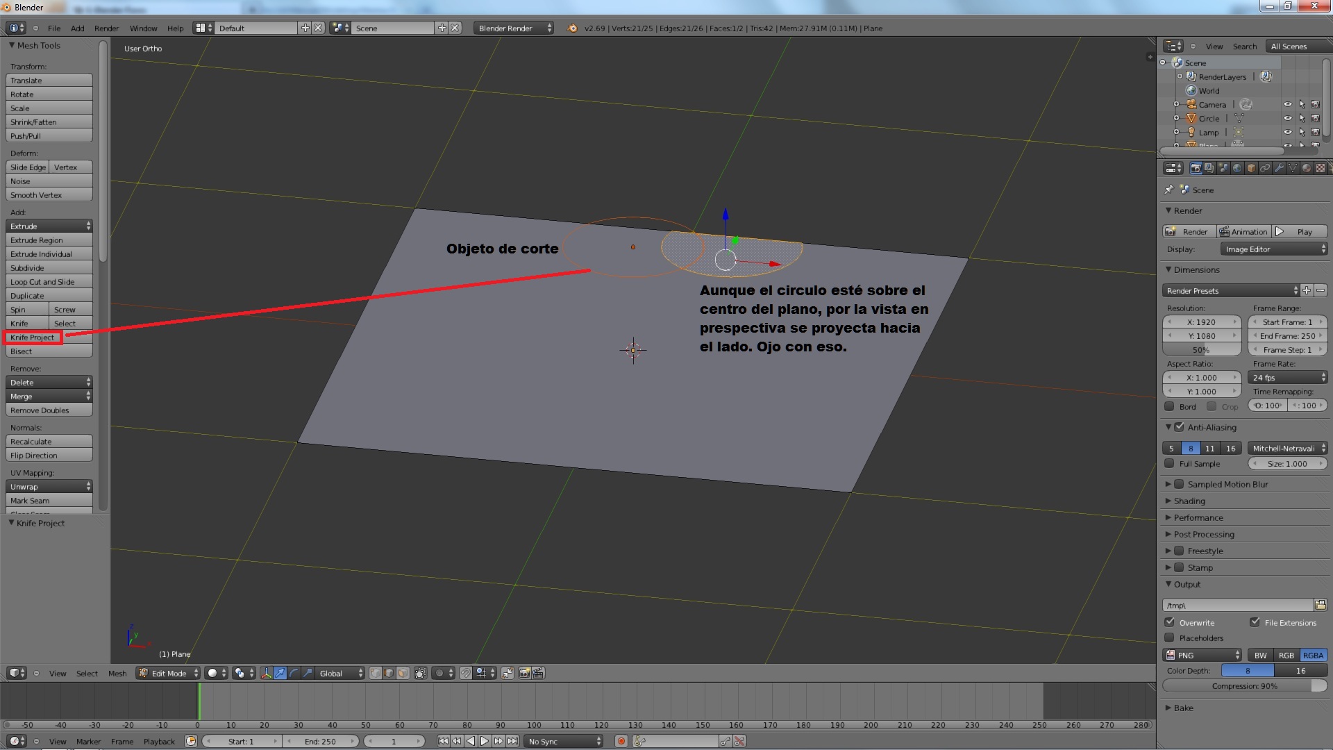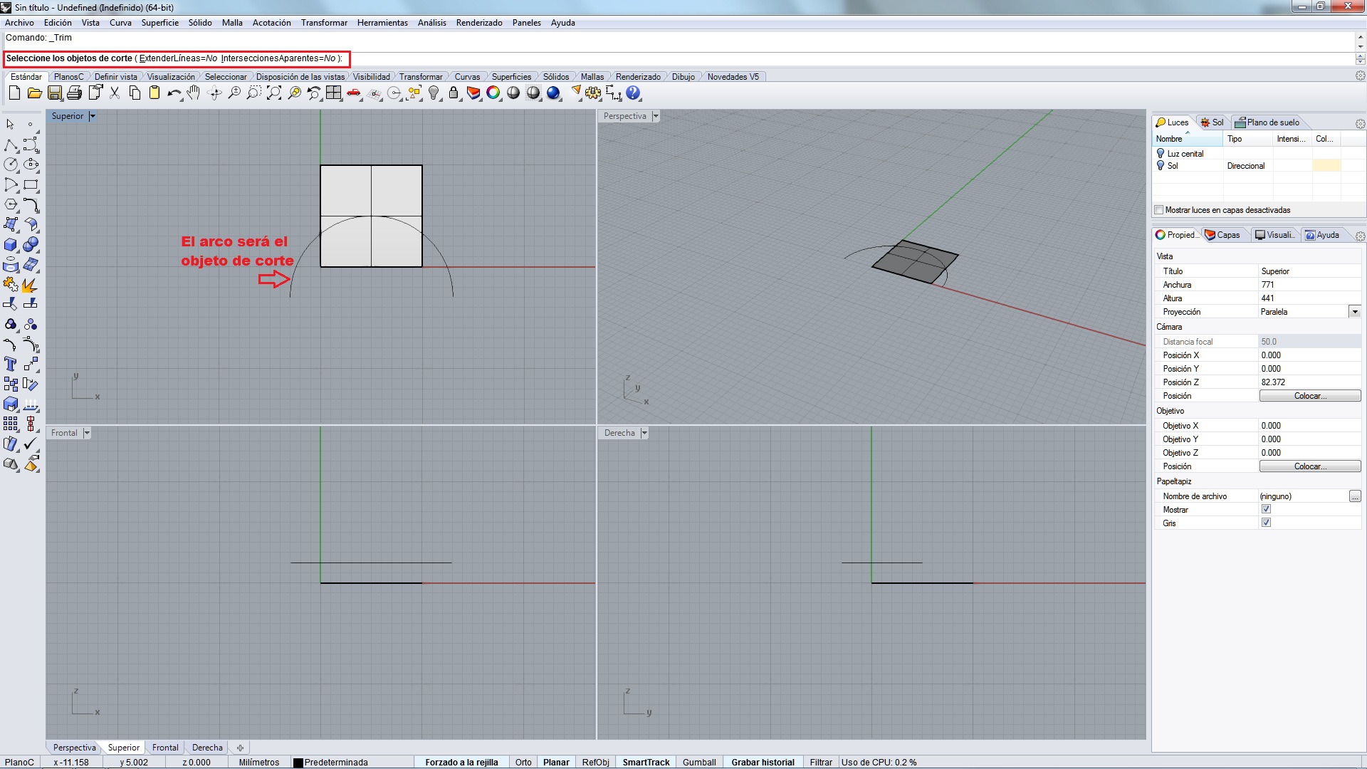 Un dato importante, si proyectamos la curva en vista perspectiva, esta se proyectará según sea nuestra perspectiva, con lo cual si queremos hacer un corte en el centro del plano pero aparentemente la curva coincide sobre una lado o una esquina, nos cortará precisamente eso, el lado o la esquina.